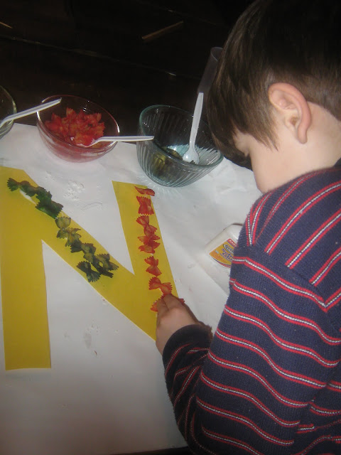 and "N is for Noodles" letter-pictures. She chose not to ignore the fact that M and N look and sound similar, but to do them together and try to emphasize the differences as well as similarities.