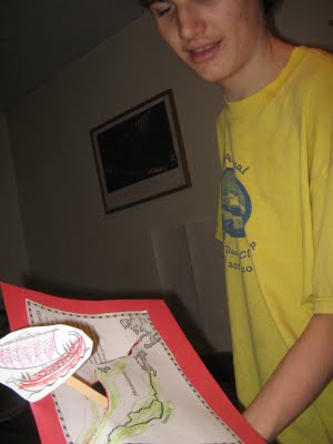 | 4 Wednesday Lots of learning activities going on at the same time all over the house. FAMILY ROOM Sam works on his final exam on history...all about Mesopotamia. LIVING ROOM Quentin researches about pirates so he can color in his pirate coloring books accurately. DINING ROOM Alex works on his science lapbook on the history of science, and made a little ship to sail down the Tigris River. James works on his page about pyramids. TABLE IN THE MASTER BEDROOM Quentin works on math problems out of Tang's Matherpieces book and has fun with. KITCHEN Pretend picnics and, of course James builds with Legos. |