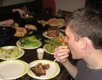 | 18 Friday The first order of buisness for the day was to get a load of wood from the driveway where the woodman delivered our Christmas wood order to inside our fence near the back door. We made Chocolate spoons to go with Hot Chocolate mix and homemade marshmallows that are planned for tomorrow. Then we made bread for the Egyptian Feast which concludes our study of Ancient Egypt. The bread dough was divided into two loaves. To one was added honey, dates, raisins and walnuts. To the other, garlic. Meanwhile Katie and Alex made a Gluten and Casein-free loaf of the sweet bread. They finished up any work they wanted to do on their mummies and their sarcophagi. Katie and James played Chinese Checkers by the fire while the bread dough finished rising. The weathermen are calling for a heavy snow storm, so after lunch I put the Egyptian beef in the slow cooker and we headed to the grocery store for provisions. Steven decided that we should get haircuts as well, so we divided up, some got haircuts while the rest shopped, until we all joined up in the end. We got back late, but dinner was quick to put on the table, and Katie learned that she liked Kippers and Sardines. |
