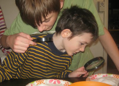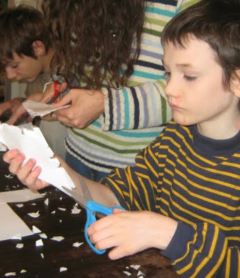 | 10 Thursday Today we made our own snowflakes. Making chocolate chip cookies for Santa. (Don't tell him that we are eating some, too.) Checking on our crystals and noticing that the salt has grown crystals. We are still waiting on the rest. The kids all listened to Sam read them a story. Quentin flew the kite in the backyard. Practiced self-generated addition, subtraction, multiplication and division problems using cups and counting sticks. Quentin practiced writing n, painted some and P is for Popcorn project. The other boys did some work with reading, writing and math. |