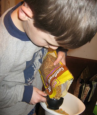 | 7 Thursday Today Sam explored Lord of the Rings, played with angles of triangles, measuring the degrees, wrote in his journal. Alex worked on his language arts, math and copywork and then we played a grammar game with adjectives and nouns. James worked on reading and separating "ow" words, some like "brown" and some like "crow" and he enjoyed making up a story to go with it. He worked on determining area in math and he drew in his journal. Quentin worked on his handwriting and painted some pictures, did some dot-to-dot pictures and of course we played with his favorite book. It is a really nice book because it has a wheel for each page and the child can turn the wheel to determine how many cookies he will give to each of the storybook characters. Each has a different response, so the story changes some for each change the child makes. It also asks him to count how many cookies he now has left, which is great for counting backwards, subtraction. Speaking of great math learning ideas, we have been having a lot of success at our house with Partial Product Method for multiplication. It is so much easier for the student and easier for the teacher to find the mistakes. Katie helped Quentin make some "Marvelous Munchies," a combination of seeds, nuts, cereal, marshmallows and honey. |
