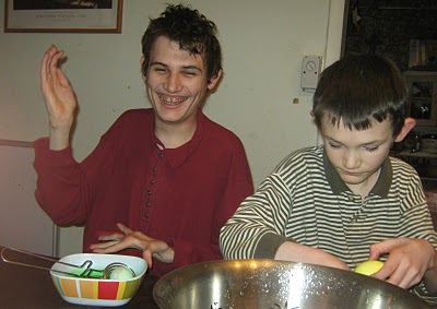 This Friday's dough was mixed and kneaded and games were played while it rested. But it was not a bread dough this time and so it was rolled and molded and given a hot water bath before being baked. Recipe here. |