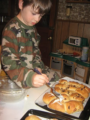 While Steven, Sam, James, Katie and Alex spring cleaned the backyardQuentin and I mixed and kneaded, rolled and baked, and glazed Hot Cross Buns and made other preparations for tomorrow. |