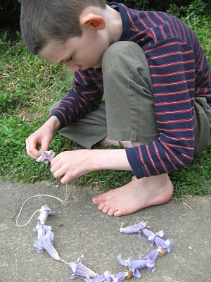 We also learned how Roman roads were made by making a dessert, layer by layer, finishing by putting "Paving Stone" cookies on the whipped cream "Cement." Then the flowering trees caught Katie's attention, and she called the boys to teach them, how to string the flowers to make leis and crowns. |