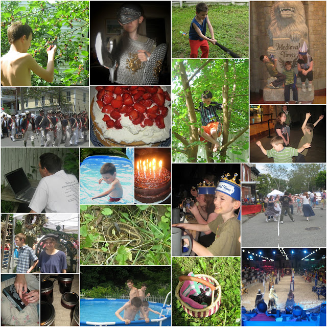 Friday: It took all morning for the pool to fill and they were anxious to get in it even though the temperature had dropped. The boys have been playing knights all day, sometimes with plastic figures, sometimes dressing up in plastic armor with wooden shields and swords. They are excited about the Middle Ages study we will be doing and I may end up starting it right away instead of waiting