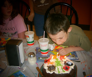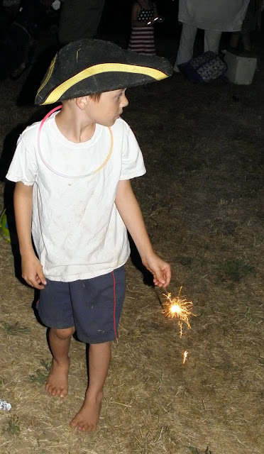 Menu: Hot dogs, Hamburgers and Boca burgers on the grill, corn on the cob, potato salad, cole slaw, Strawberry-pretzel salad, white chocolate dipped strawberries, star shaped watermelon. Quentin dressed up to be a Revolutionary War soldier. We lit sparklers. They went to the fireworks display. They played with glowsticks and braclets. A very happy 4th of July weekend.