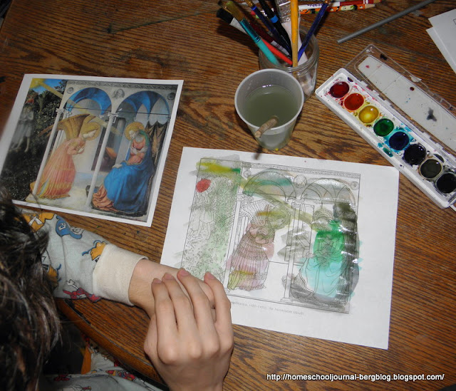 | Tuesday: We used watercolor and coloring pages to aid our study of Fra Angelica's Annunciation. We finished decorating for Halloween and the little boys decorated the haunted house kit. |
