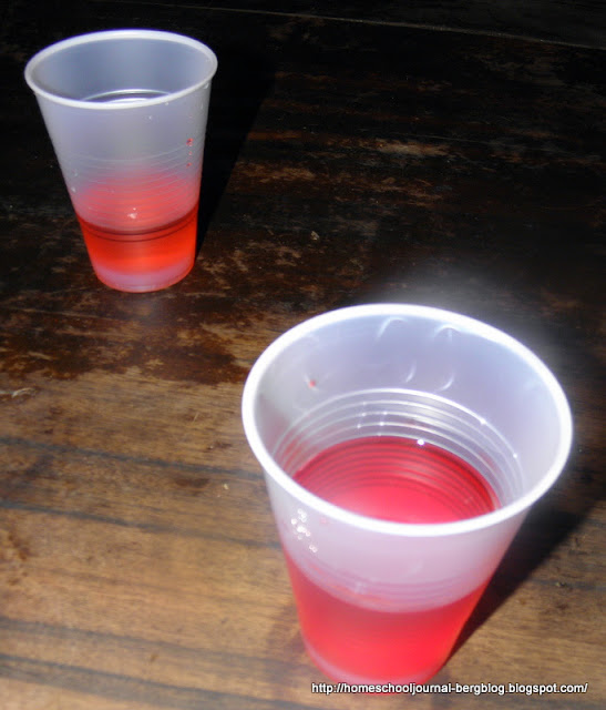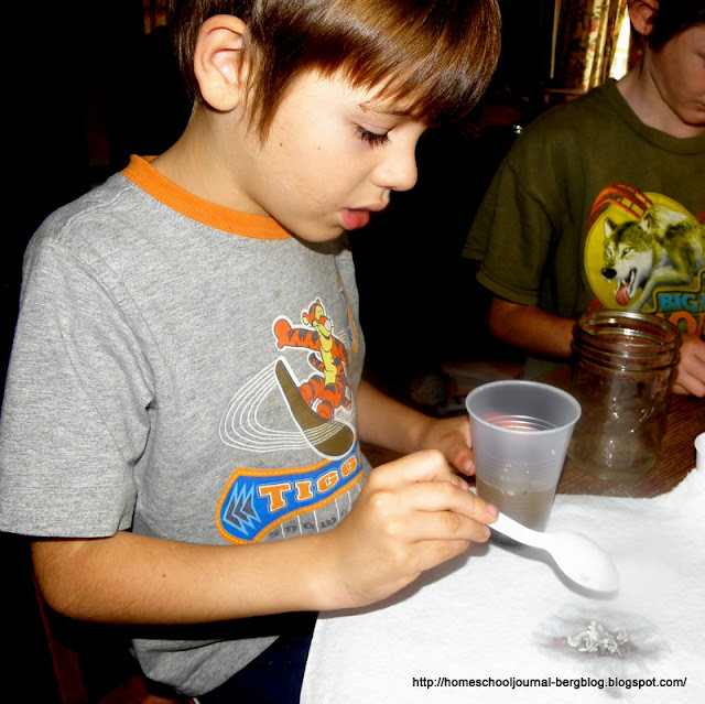 Wednesday...We worked on our lessons in chemistry by separating a mixture of salt, sand, iron filings and wax shavings. They did a very good job figuring it out even though once the sand and iron filing were wet, they stuck together, and the magnet picked them both up.