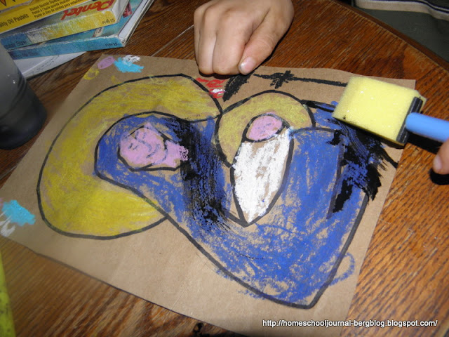 | Tuesday: Steven took James to the dentist to get him fitted for braces (see above). We made pastel resist pictures for our last day of Fra Angelico artist study. |