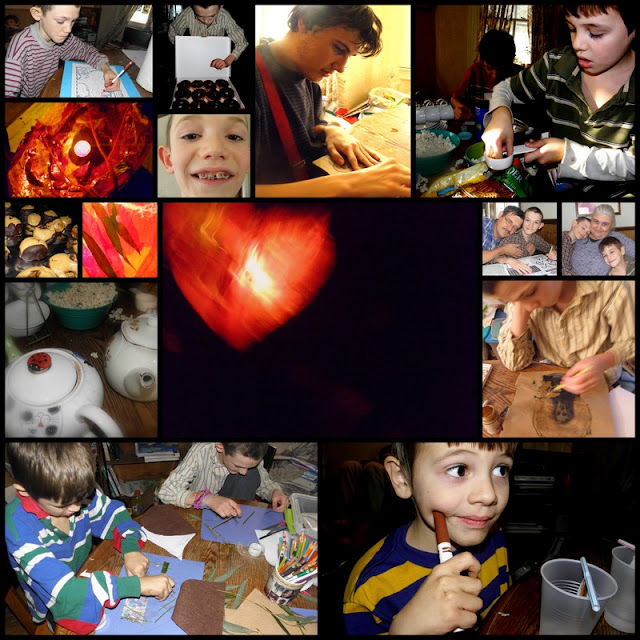 | Thursday: We finished our Martinmas lanterns and when evening fell we went for a walk across a little bridge by the bay. Earlier Steven took the boys to the park to play with friends. |