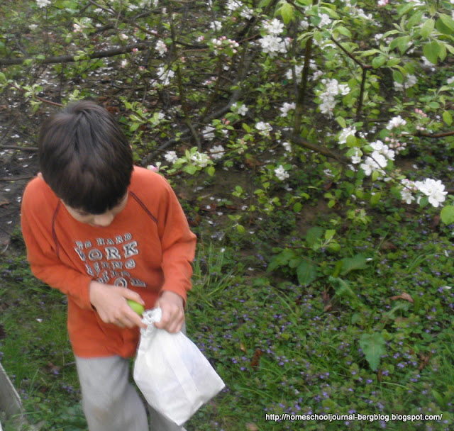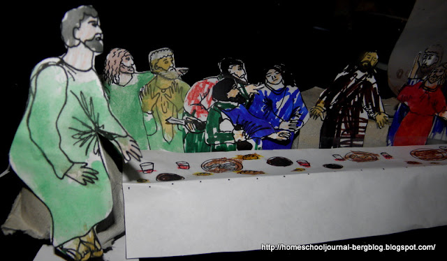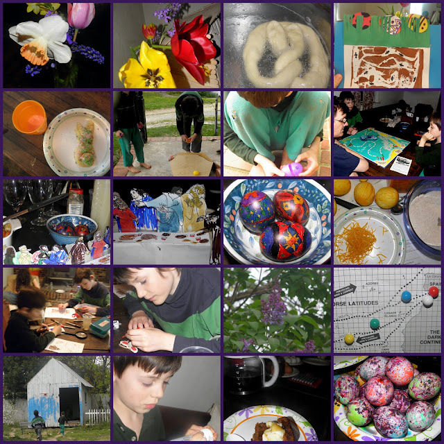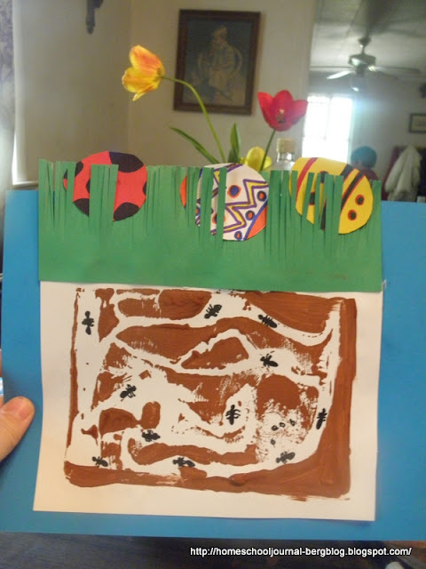 | 21 Maundy Thursday This morning Quentin wanted us to draw together, so I helped him draw a picture of Mr. Hyde. I made up some pretzel dough to rise. We did block prints with recycled foam trays, added some grass for Easter Eggs to hide in, and then some ants. While they finished up their pictures, we took turns twisting the pretzel dough, and then I par-boiled and baked them. We looked at Michelangelo's Pieta, and started a sculptue project. We then had a Toy Story marathon (I,II and III). Right before bed we did Maundy Thursday's foot washing. We put everyone's name in a bowl and everyone draws a name and that is whose feet they wash. |