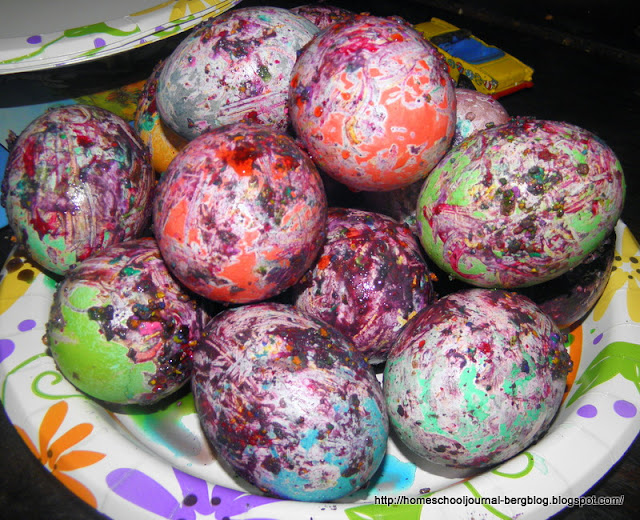 | 18 Monday We played jellybean and eggs math games. We dyed eggs and made a Pysanky-type eggs. We had an egg hunt with real eggs, per Quentin's request We had honey cake and ice cream for teatime. |