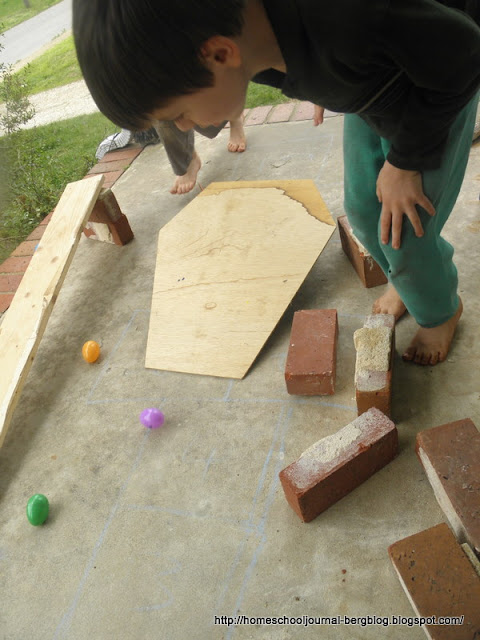 | 19 Tuesday In the morning the boys played outside, and James took some more pictures. We peeled the eggs we had colored and enjoyed the marbled look of the eggs inside which made a colorful egg salad for lunch. The little boys colored bunny Easter decorations and Katie made more faux Pysanky eggs, while I made Meyer Lemon Tea Cakes for teatime. The little boys also worked on a model of DiVinci's Last Supper because today was Passover. I set up some Easter Egg games for Quentin. We had a Passover dinner. |