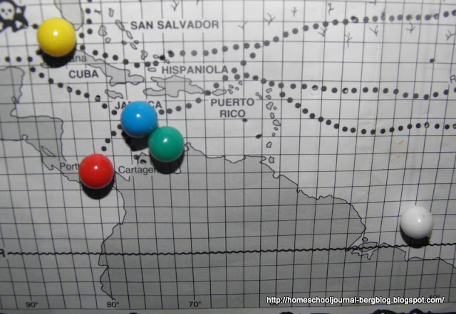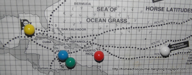 Alex (blue) and Quentin (green) had a battle, with Quentin attempting to take the gold off of Alex's ship. Alex fought bravely however and Quentin had to retreat. Sam (yellow) made it to port and is provisioning his ship. James (red) and Katie (white) are making progress toward Spain with their gold still on board. |