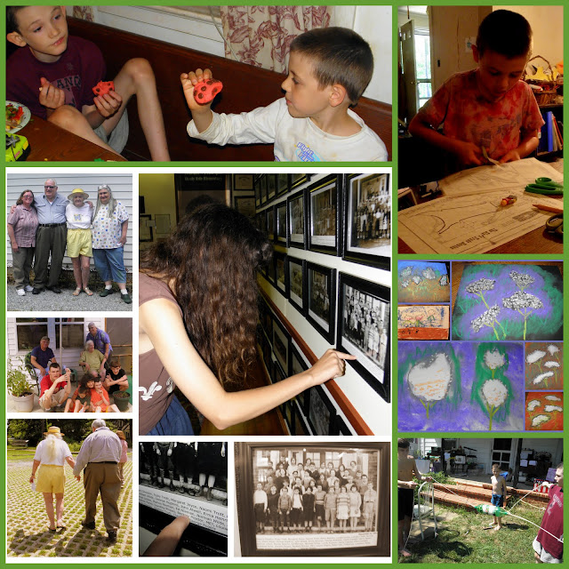 (top left) My SIL, Brenda and brother Philip, my mother and myself. (middle left) My brother, Bryan, my mother and I, with my five kids. (bottom left) My mother and brother, Phil. (right) Went to the Salem-Avery Museum to see the display of elementary schools in the area, and Katie found her grandfather's (my father's) name. |