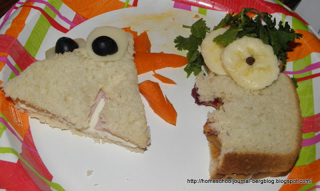 | Phineas and Ferb Day began with these sandwiches for lunch, along with P & F fruit snacks and watching the show, of course. |