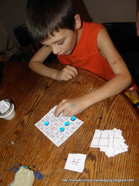 | We played a Bingo-type game to learn coin values by making a 5 x 5 square grid which we filled in each square with coin values (1, 5, 10, 25 and 50). Meanwhile I write various combinations values of the coins (such as 34, 2, 16) slips of paper. He chose a card and put that amount of counters (although real coins would have been better!) on the grid to equal the amount shown on the index card. To win, he must fill in as many squares as he could, and with each play he wanted to better his score. You could play it with two or more people, each with their own boards. |