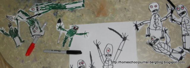 | Quentin enjoys drawing and cutting out paper people. This week he has made a number of aliens and skeletons. |