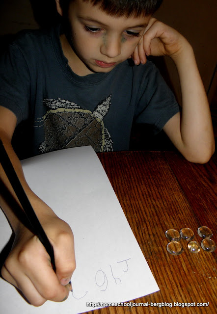 I had Quentin count items...glass counters, marbles, blocks. Then he skip counted by 2's, by 5's and by 10's. I had him write them down for his math folder.