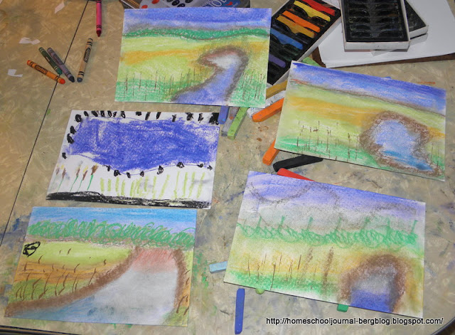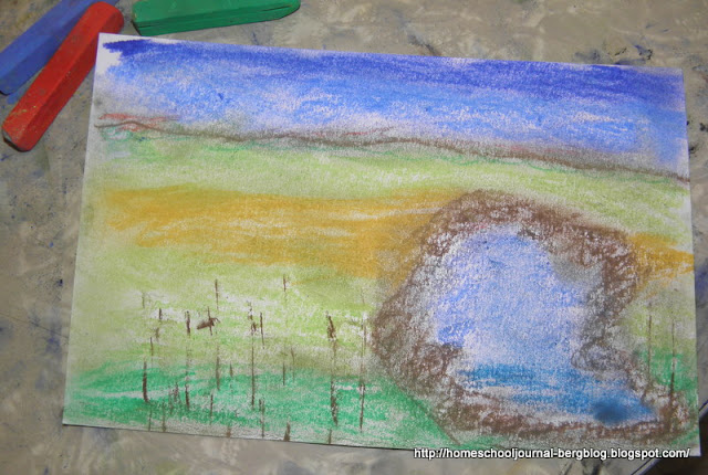 Sam is continuing his geography study with Paddle-to-the-Sea. He studied the characteristics of a marsh and made a pastel sketch of one from the tutorial at Hodgepodge...