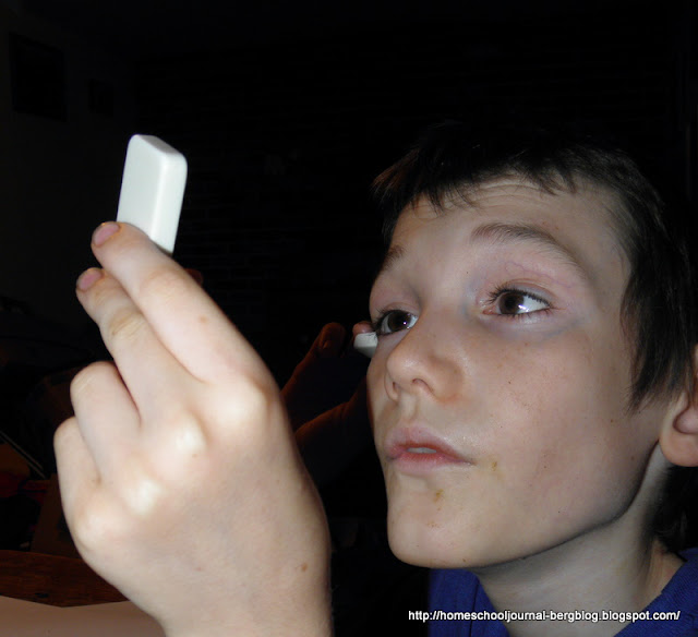 Instead of using flashcards to practice our addition facts, we played War with dominoes. James wanted to play too, so I had him tell by how much the winner won.