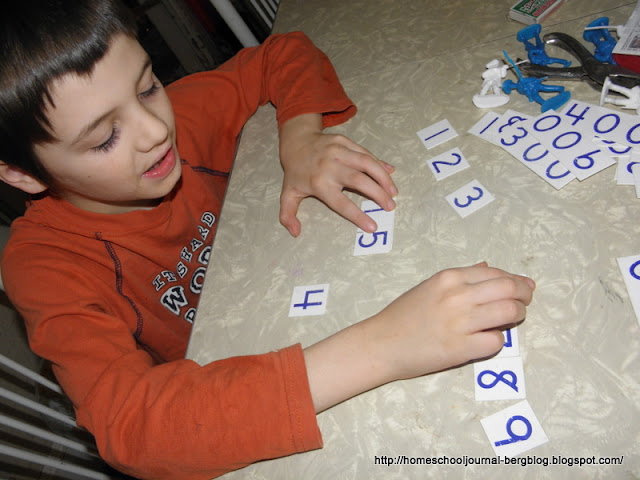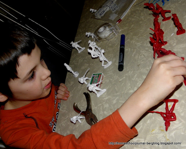 For history this week we learned about the Revolutionary war and the boys set up plastic figures of the English, Colonists and French soldiers and reenacted the battles. They then went on to play a game that involved them each setting up one side of soldiers and then taking turns rolling a die to see how many soldiers they hit on the other side. Quentin pointed out that the Colonists hid behind barriers and so were harder to hit, so they determined that each barrier also counted in the amount that had to be hit, giving the Colonists quite an advantage.