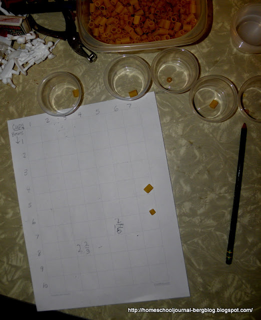 This week we begin recording his discoveries on a graph. Using a 10x7 graph,(although I would have preferred a 10x10 graph), we labeled the top "cups" and labeled each column with numbers 1-7. We labeled the side as total number of "macaroni/beans" and labeled each row 1-10. Using the macaroni and cups, he began filling the chart out, recording the remainders as fractions as needed.