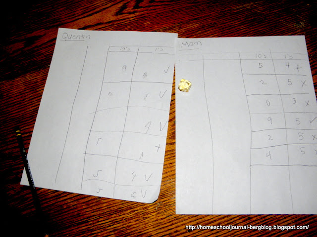 Quentin and I have been working on addition and subtraction for the last few weeks. At this point I needed to take some time out to make sure he knew enough about place value that he could accurately identify the larger and smaller of two numbers so that when he make up his own addition and subtraction problems, he can be sure to put the larger number and small number in the correct places. We played a game to practice this skill, and was able to throw in the less than/more than symbol as well.