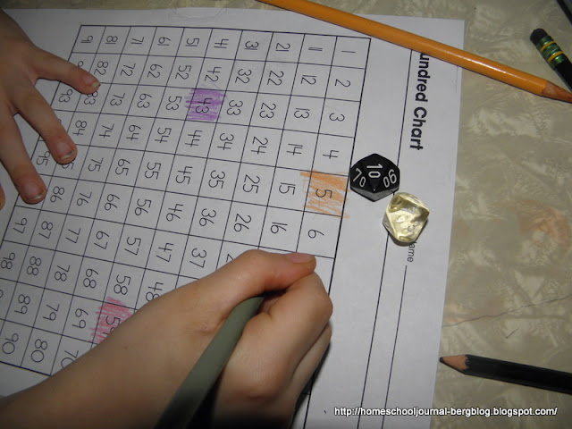 Quentin worked on a place value game with a 10's die and a 1's die. He would roll them and then find the number on a hundreds chart and color it in.