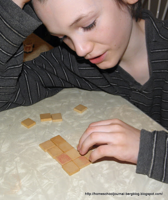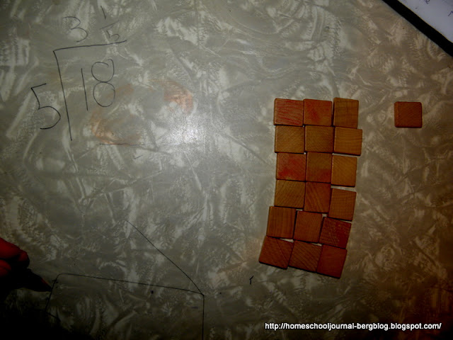 Now we talked about how to record our problems. Using a piece of paper {or if you're lucky enough to have a table that you can erase easily, you can just write on the table : )}, I told him to record the number of rows we wanted to make on the left hand side. In this case 5 for the five rows. (I know there are 6 in the picture; I took the picture after we were done with the problem and we were looking at the patterns created by adding additional rows....how does the problem change?) We then put the total of the number of tiles in the center. Now he recorded the number of columns in the rectangle at the top. Any remainders were written as fractions as before.