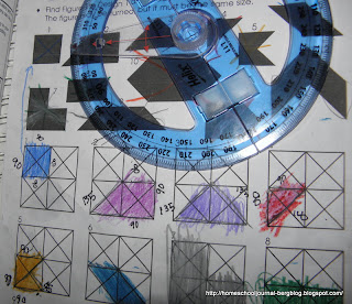 James reviewed acute, obtuse and right angles. He then worked on a worksheet in which he was to find various figures. We then looked for the various angles in them with a protractor.