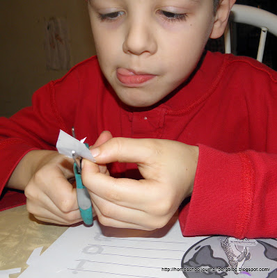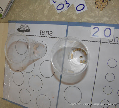 Quentin warmed up his math skills after our break by playing what we call the funny counting game. We use number cards above the appropriate sections of our place value board and he counts either forward or backwards, adding or subtracting beans and changing the cards to match the amounts of beans. All this practice will make regrouping for subtraction problems and carrying over for addition problems easier.