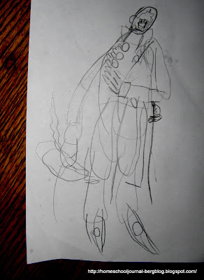 Today we learned about the French Revolution. James and Sam were not feeling well, so they rested. Quentin was still interested in the new history-handwriting-drawing book, so he sketched another picture of Napoleon and one of Sacajawea. Alex sketched and wrote about the Alamo (yes, he is a bit ahead).