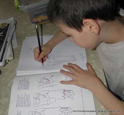 Today Quentin started back with Learn To Read in 100 Easy Lessons which we had dropped last year in favor of a more relaxed approach. I am having a problem with him catching on to reading despite the fact that I have not seen any obvious signs of any learning disability. I keep thinking that perhaps he is just not ready for it, or perhaps that he doesn't want to compete or get ahead of James, who has lots of LD issues and is years below where most of his peers are. It is easy to get worried about those who don't even have LD's when you see so many others beginning to read at four years old and younger. I caution others about it all the time, and yet I fall prey to it myself from time to time. At any rate, I thought that some structured lessons wouldn't hurt either of us a bit. I started him off about mid-book and he did fine with the lesson, which made us both feel as if we had accomplished something. James read me some poetry from Surprises and then told me a story, which I wrote down and he illustrated. Alex and James finished up some math work leftover from Monday, and we had to clarify for James how to measure angles of an object as he kept moving his protractor too much and not measuring the angles correctly. It is tricky business, especially since both he and I have to fight our dyslexic/dysgraphic tendencies, which sometimes distort perceptions. We read a bit from Quentin's Human Body book he got for Christmas.