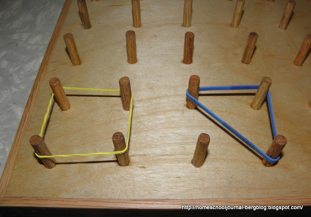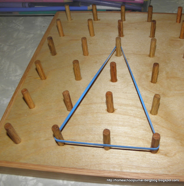 with finding area on the geoboard, using one square as our standard for one unit, and making various triangles, starting with the basic one-half...