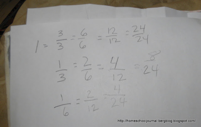 Next I used a plain piece of paper and folded it first in half and then continuing to fold in half, each time asking them what fraction the parts could be written down as. With guided questions, we filled out a chart of equivalent fractions. Using the chart, we then worked on a problem or two using unlike fractions and helping them as they needed to look through the list we had just made for equivalent fractions.