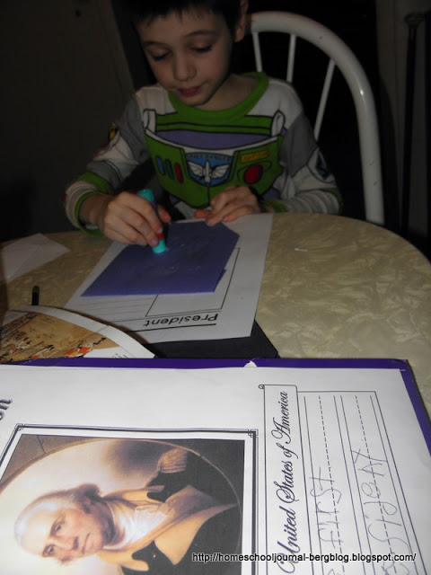 We made Presidential Pockets which they filled with drawings of objects that represent the president of their choice, and ate chocolate log. It was supposed to represent Lincoln's logs but Steven suggested that it could represent Washington's Cherry Tree as well.