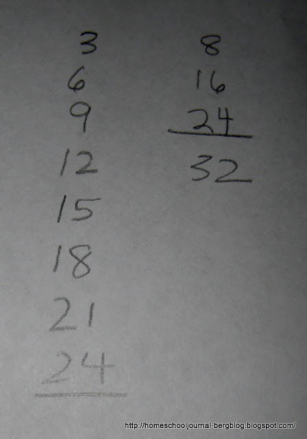 On another day we played another game called, "Start With-Go By." To play, you begin by picking a number, say in this case, the number 3 and asking him to go by 3, generating a list of numbers which are three apart from each other. You then ask your student to start with another number, say 8 and go by 8 and he can generate another list of numbers. There was no specific length to this list, we just went until we felt we had generated a good list of numbers. Then I asked him to tell the numbers that were in both columns and we underlined those.