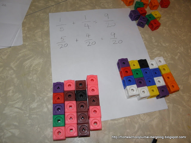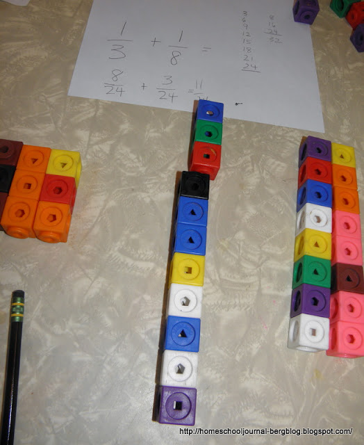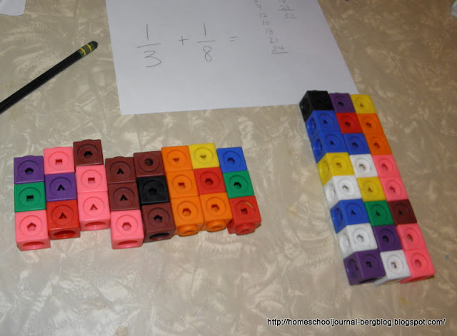 I asked him to take the first number given on the both list, which in this case was 24, and make two cube sticks of that length. Now break the first cube stick into sticks of 3 in length so that we could change the 1/5 into an equivalent fraction. He made eight sticks. We wrote down the equivalent fraction as 8/24 or eight sticks of three out of a 24 stick cube. The second stick was broken into sticks eight cubes long. We could then write the equivalent fraction for 1/8 as 3/24 or 3 cube sticks 8 cubes long out of a 24 cube stick.