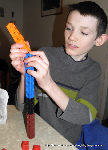 To assist him, I continued being his scribe for awhile. I divided a couple of sheets of paper into sections, labeled the top of each section with a number. This number was the length of the cube stick. I just recorded what he told me about his discoveries. We worked on this for as little or as long as he wanted to for a few days. When we continued it on another day I felt he was ready to record his own discoveries and finish his chart of equivalent fractions.