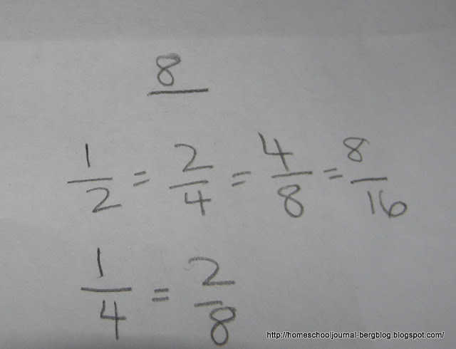 I continue asking him to break the whole stick into various divisions and asking him what equivalent fractions they are. I record them for him on a sheet of paper as he answers the questions or makes discoveries himself.