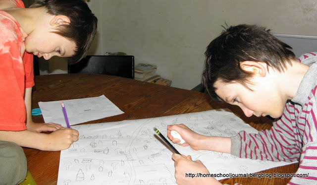 We have been learning about the changes in England brought about by the Industrial and Farming Revolutions. The boys drew on large sheets of paper towns in England as they progressed from 100 to 1850. They spent about two solid hours on it, and learned more about the effects of the Industrial Revolution than I could have taught them in any other way.