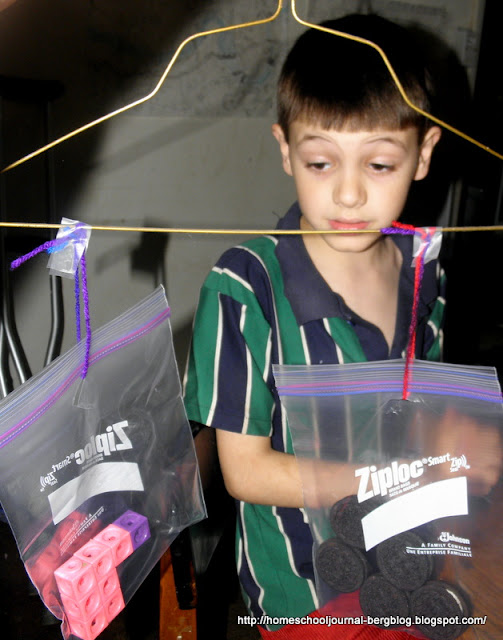 Next we made a balance scale with hanger and plastic bags. I had Quentin choose an object in the room and estimate the number of Oreos he thought equaled the mass of the object chosen.