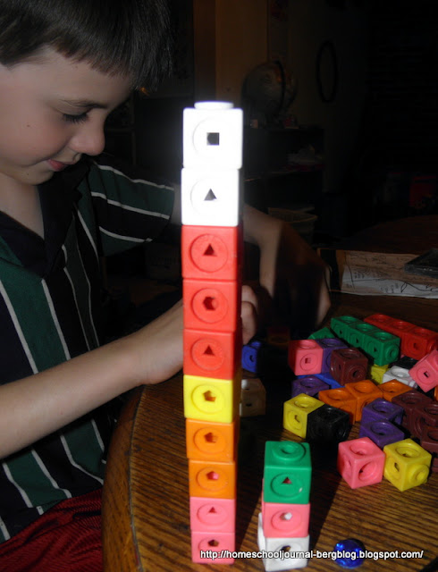 The recent discussions going around on Love2Learn2Day and Almost Unschoolers made me once again review my thoughts on mathematics. It seems to me that we rush our kids through early math concepts so they can get through all they need to have before graduation. I know many homeschoolers judge how well you are doing as a teacher by how far along in math your children are. I guess I have given all of that up, choosing to take a long, pondering course with math, trying to instill a firm grounding in the basic concepts and building a joy for the beauty of math along the way.