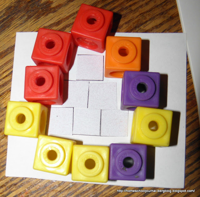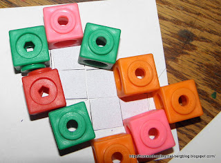 Using Surrounding Pattern pages, Quentin put the Unifix cubes back on the graph paper on top of the patterns. Then he took the cubes for each row and snap the cubes together and compare the number of cubes with those used in the previous surrounding. He broke the rods into rows of ten and whatever is left over.
