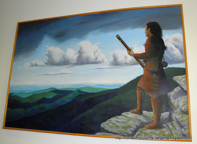 | A large painting on the wall of the Elizabethton Library of Daniel Boone looking at Kentucky. |