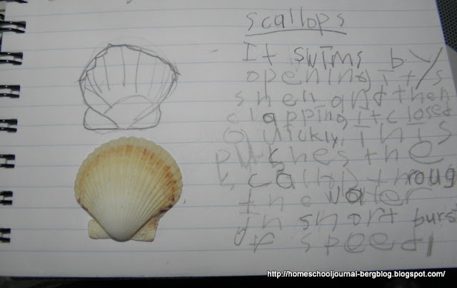 They are getting more used to making their own notebook pages, knowing what things I expect them to include (picture and so many bits of information). Alex sketched the oyster in pencil, traced the outline with marker and then shaded the rest with colored pencils.
