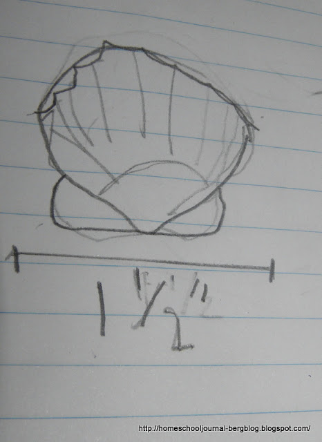 James noticed that the field guides use measurements as a way to help make identification for the various types of shells. We measured our shells and added this to our pages. If our sketches were larger than life, we just measured the actual shell and put it's actual measurement next to the sketch.