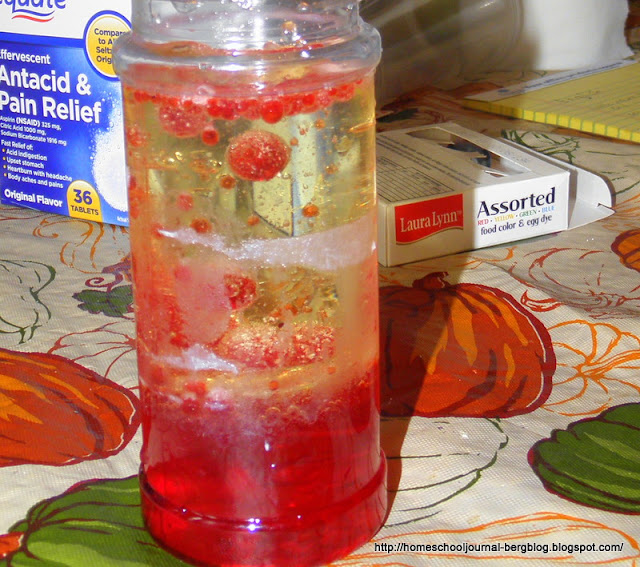 The Erupting Lava Bottle is something I have been wanting to do all summer, but never got around to it. After the boys had been doing a fair amount of table and notebook work, we decided we needed a bit of a hands-on break, so we did this fun experiment It combines the effects of two very familiar experiments- that oil and water don't mix and the effect of baking soda and acid, to make a beautiful display as the colored water gets pulled through the oil. giving them a quick lesson in density.