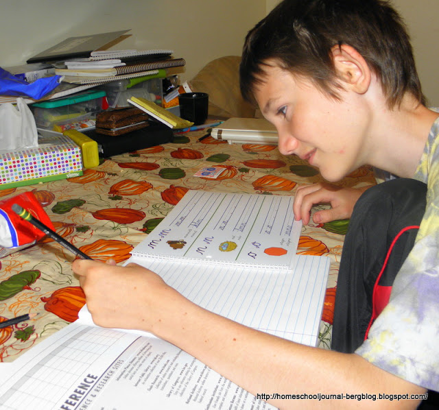 James is learning cursive writing this year. Instead of buying a handwriting curriculum, I just bought a write-on/wipe off booklet from Wal-mart that he can use and then reference while he writes in his journals.